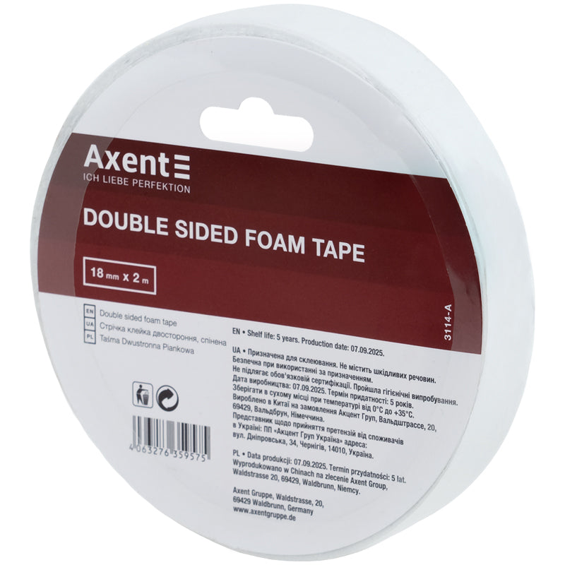 - Стрічка клейка двостороння Axent 3114-A, 18 мм х 2 м, спінена, в індивідуальному пакуванні