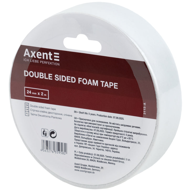 Стрічка клейка двостороння Axent 3115-A, 24 мм х 2 м, спінена, в індивідуальному пакуванні